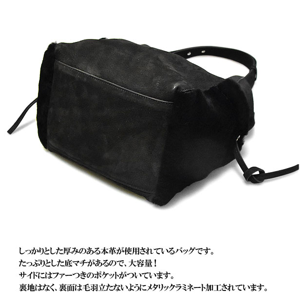 タテ約34cm×ヨコ約23cm/サイド・底マチ:約14cm/持ち手:約43cm重さ:約830g 本革(牛革)/ポケットファー:羊革 Made In Itaiyと素材や製法デザインにまでこだわった上質なバッグを展開しているブランド≪アニタビラルディ≫のファーバッグです。